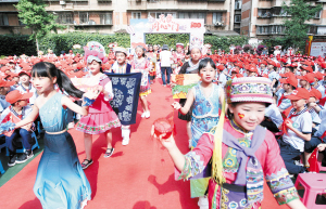 “民族花朵心向党”活动在西山区棕树营小学启动。 记者赵伟摄