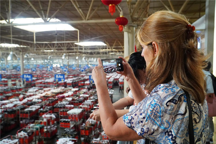 2024“一带一路”媒体合作论坛联合采访调研行成员在昆明国际花卉拍卖交易中心参观拍照。