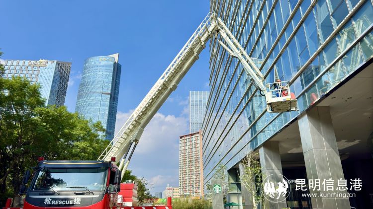 在火灾扑救实战演习中,模拟俊发中心3楼发生火灾,火势蔓延迅速,内部有多人被困,现场情况危急。接到报警后,盘龙区消防救援大队派出多支救援力量赶赴现场,全力排查、营救、疏散被困人员,并部署云梯车转移窗边呼救人员。