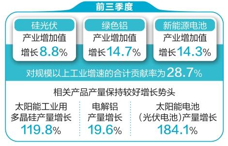 今年前三季度,全省工业“新三样”依然抢眼。硅光伏、绿色铝、新能源电池产业增加值分别增长8.8%、14.7%、14.3%,分别高于规模以上工业增速5.4、11.3、10.9个百分点,对规模以上工业增速的合计贡献率为28.7%。相关产品产量保持较好增长势头,太阳能电池(光伏电池)产量增长184.1%,太阳能工业用多晶硅产量增长119.8%,电解铝产量增长19.6%。