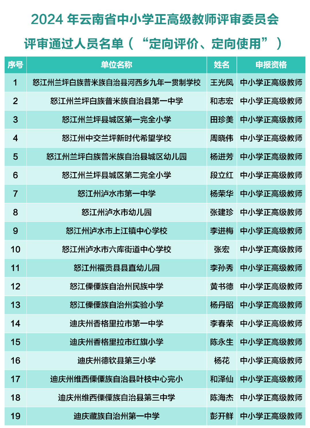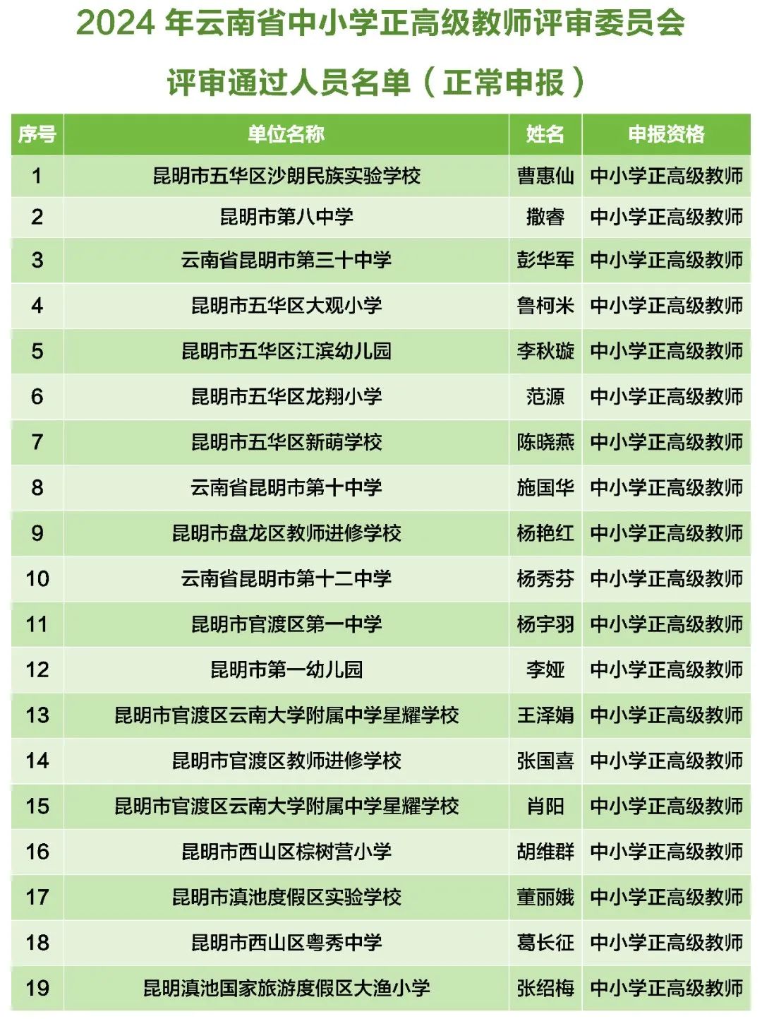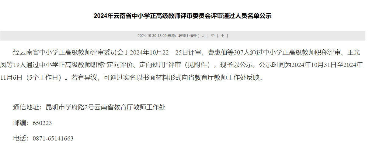 昆明信息港讯 记者上官艳君 10月30日,云南省教育厅公示了《2024年云南省中小学正高级教师评审委员会评审通过人员名单》,其中,通过中小学正高级教师职称评审的有307人,通过中小学正高级教师职称“定向评价、定向使用”评审的有19人。