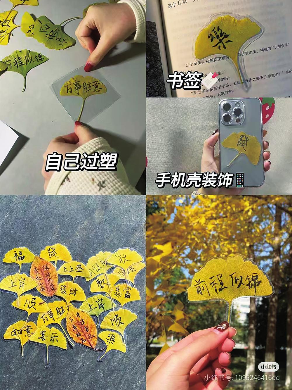 过塑的银杏叶,既能做书签,又能装饰手机壳。
