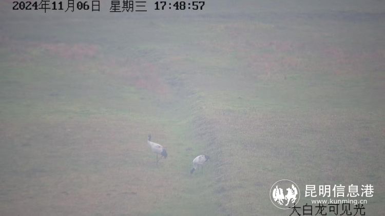 昆明信息港讯 记者任丹 通讯员范雷 阴雨绵绵,气温骤降,2024年11月6日17时49分,寻甸黑颈鹤保护区工作人员通过视频监控系统监测到2只黑颈鹤飞临寻甸黑颈鹤保护区大白龙海子悠闲觅食,标志着国家一级重点保护野生动物黑颈鹤在我国最南端越冬地的“越冬之旅”正式开启。