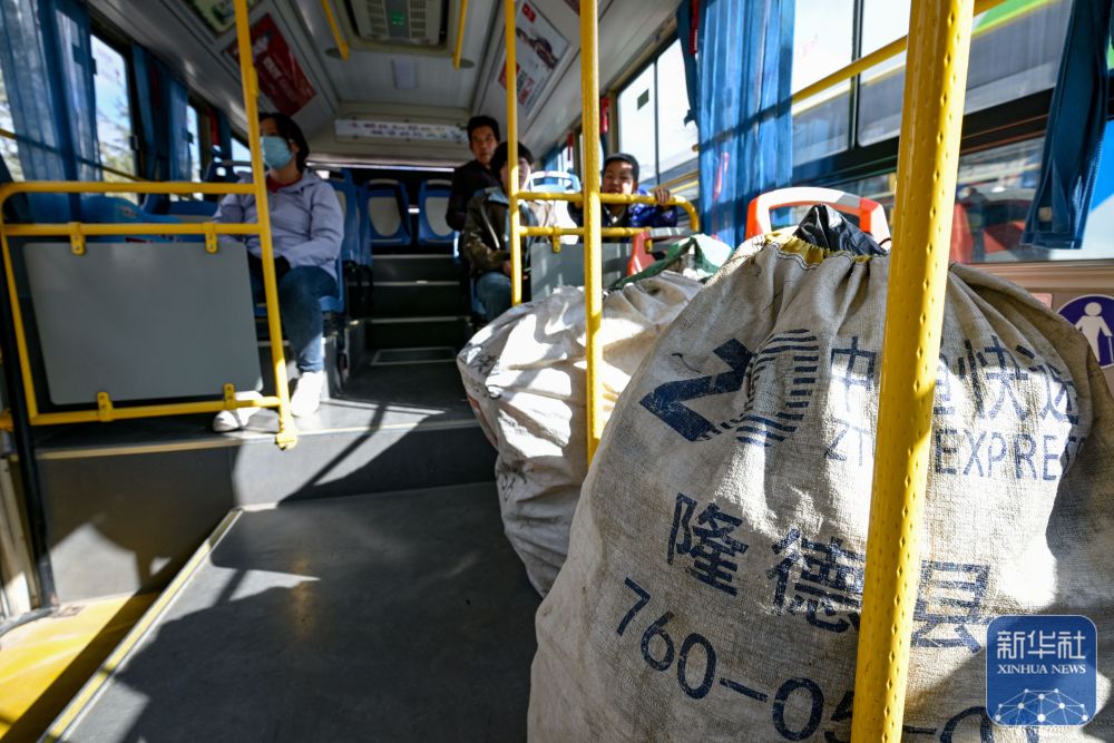 11月9日,隆德县一辆公交车上装有寄往乡村的快递。