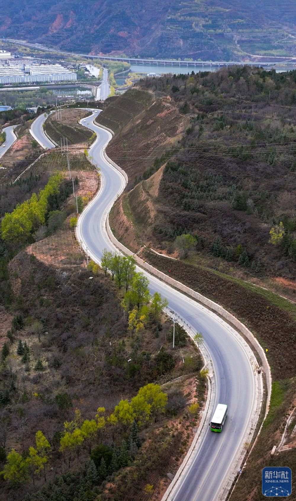11月9日,一辆载有乘客和快递物品的公交车从隆德县城驶出(无人机照片)。