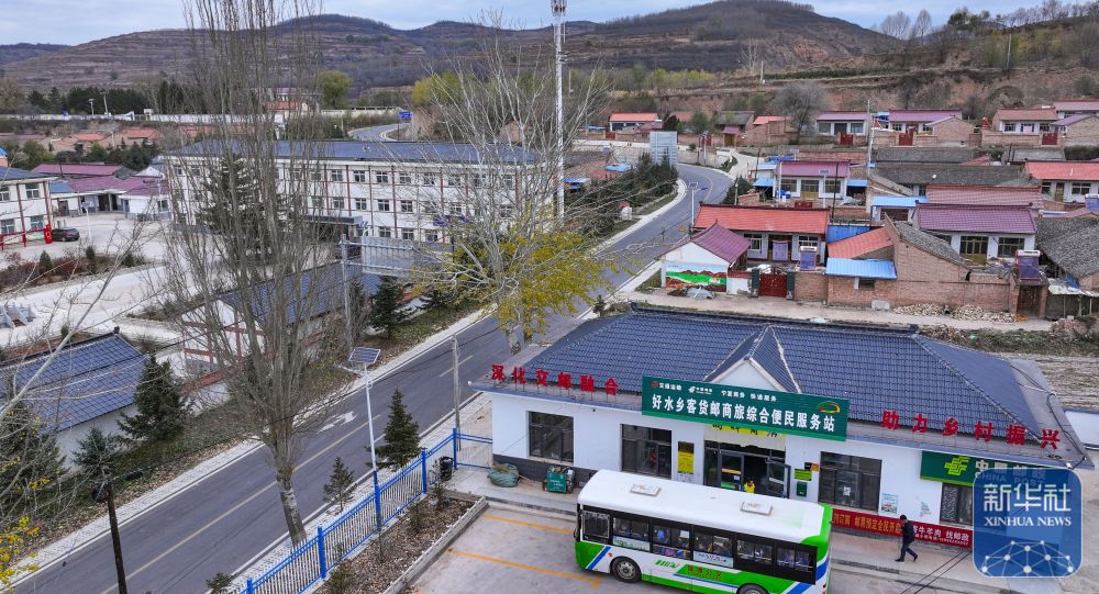 11月9日,一辆公交车停靠在隆德县好水乡客货邮商旅综合便民服务站,准备卸下快递(无人机照片)。