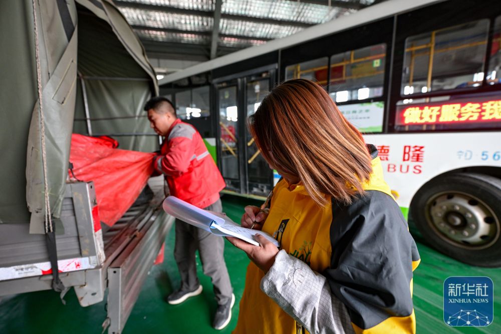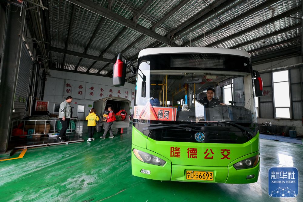 11月9日,一辆载有快递物品的城乡公交车从隆德公交公司仓库驶出。