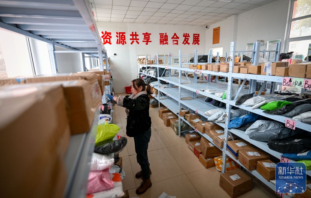 11月10日,隆德县联财镇客货邮商旅综合便民服务站工作人员在整理快递。