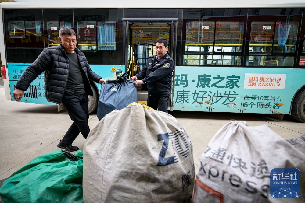 11月10日,隆德县公交车司机(右)和联财镇联合村快递点经营者将快递卸下公交车。
