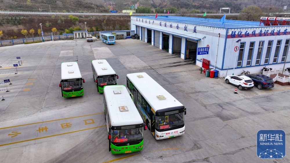载有快递物品的城乡公交车即将从隆德县公交公司驶出(11月9日摄,无人机照片)。