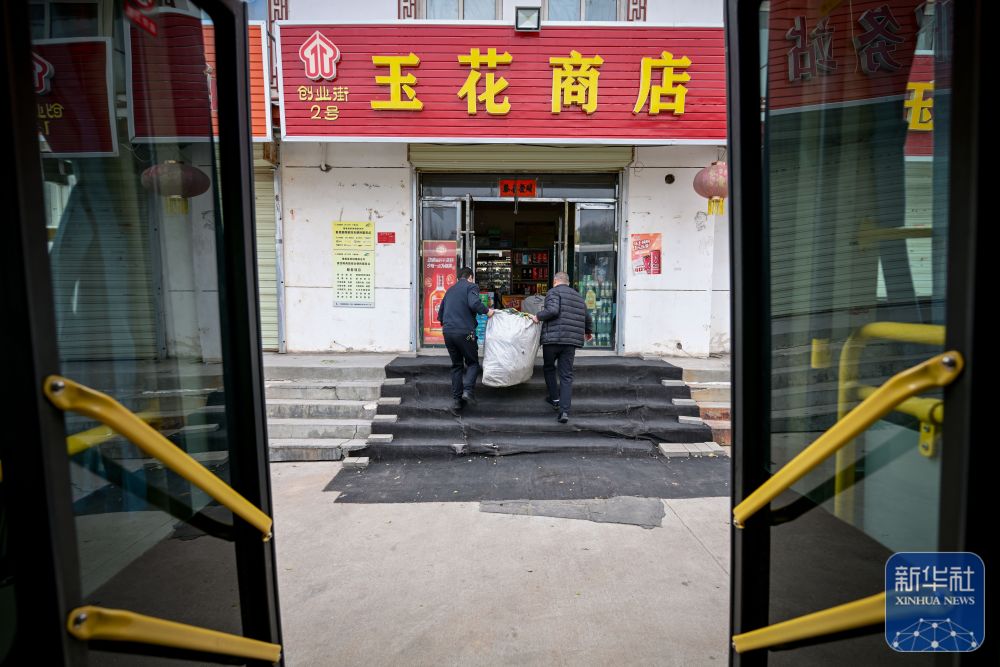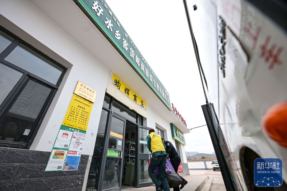 11月9日,隆德县公交车司机和好水乡客货邮商旅综合便民服务站经营者从公交车上卸下快递物品。