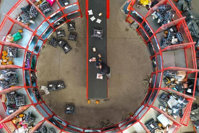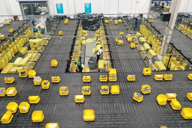 11月6日,工作人员在山东省宁阳县菜鸟智慧物流园内分拣快递商品(无人机照片)。新华社记者 朱峥 摄
