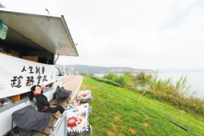 游客在最美环湖路边喝咖啡。