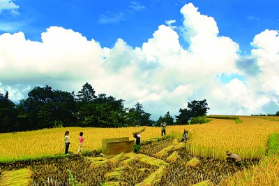 丰收时节,村民们在哈尼梯田割稻打谷。金家茂摄 图片由北京国际摄影周“中国稻作文化影像展”提供
