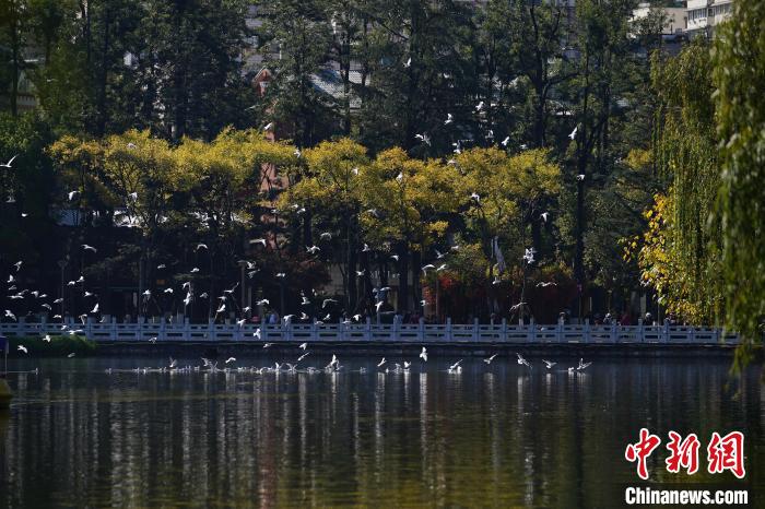 11月15日,越冬红嘴鸥在翠湖公园翱翔。初冬时节,昆明天气晴好,温暖宜人,众多市民和游客来到户外,感受春城冬日的别样魅力。中新社记者 刘冉阳 摄
