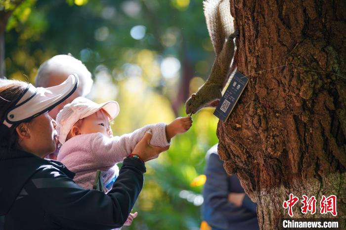11月15日,小朋友和家人在公园喂松鼠。初冬时节,昆明天气晴好,温暖宜人,众多市民和游客来到户外,感受春城冬日的别样魅力。中新社记者 刘冉阳 摄