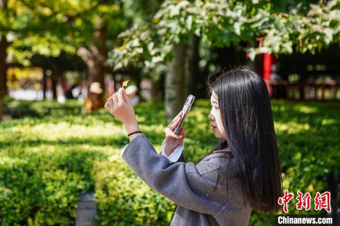11月15日,游客用手机拍下漂亮的银杏叶。初冬时节,昆明天气晴好,温暖宜人,众多市民和游客来到户外,感受春城冬日的别样魅力。中新社记者 刘冉阳 摄