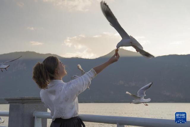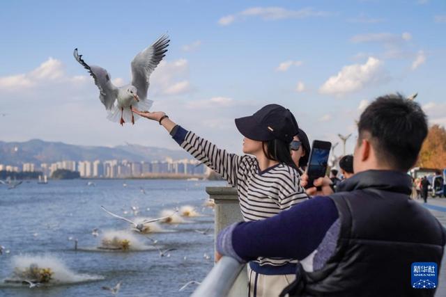 11月20日,游客在昆明市海埂大坝上投喂红嘴鸥。