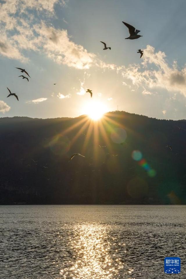 11月20日在昆明市海埂大坝上拍摄的夕阳与红嘴鸥。