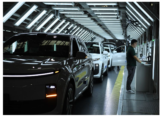 在江苏常州理想汽车智能制造基地总装车间,工作人员在检查车辆外饰(2024年5月31日)。新华社记者 柳文惠 摄