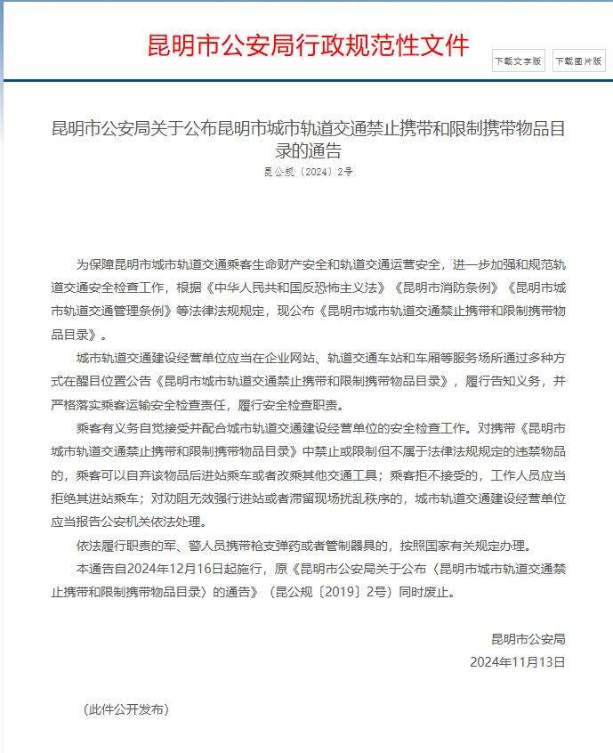 据文件显示,通告自2024年12月16日起施行,原《昆明市公安局关于公布〈昆明市城市轨道交通禁止携带和限制携带物品目录〉的通告》(昆公规〔2019〕2号)同时废止。