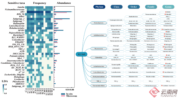 草甘膦对土壤细菌群落的丰度、多样性及网络复杂性表现出“双重效应”。适当浓度下,草甘膦可刺激微生物活性,增加群落多样性和网络复杂性;但当浓度超过阈值或暴露时间延长时,则可能对微生物产生不利影响。此外,草甘膦显著改变了茶园土壤中的细菌群落结构,优势菌群发生变化,代谢功能也随之改变。功能预测分析表明,草甘膦暴露后,土壤微生物的生物合成和代谢相关通路增加,而碳水化合物代谢、氮代谢及外源化合物生物降解相关通路减少。通过Lefse分析及构建的四重降解标志物判定标准,鉴定出多种可能参与草甘膦降解的关键细菌类群,包括变形菌门(Proteobacteria)、酸杆菌门(Acidobacteriota)、绿弯菌门(Chloroflexi)和放线菌门(Actinobacteriota)等,这些微生物可通过代谢途径协同参与草甘膦降解。此外,团队从长期施用草甘膦的茶园土壤中成功分离并筛选出一种高效降解草甘膦的微生物联合体,其在7天内可降解400mg/L的草甘膦,其中Afipia、Dokdonella和Cohnella等细菌属的丰度显著增加,与草甘膦降解密切相关。