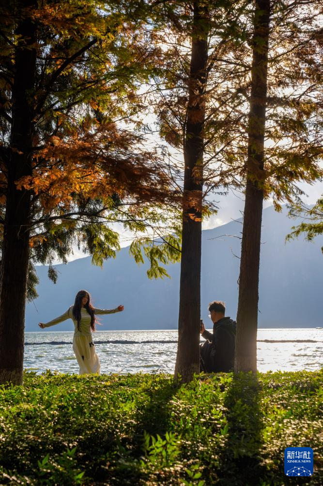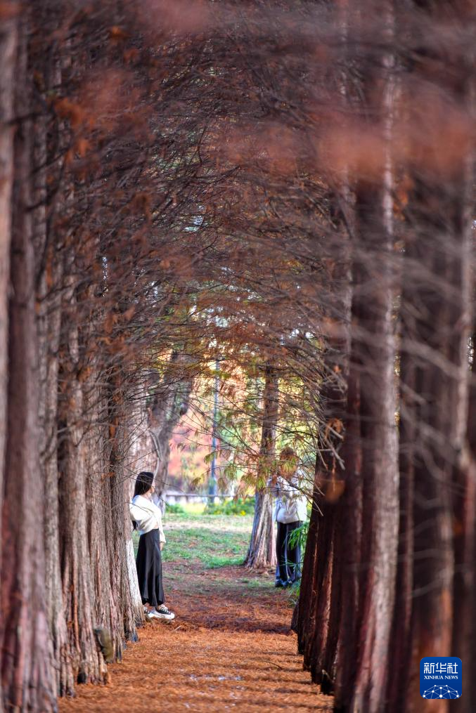 初冬时节,云南省昆明市海洪湿地公园的水杉迎来观赏季,不少游客前往观光游玩。