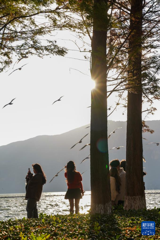 11月24日,游客在昆明市海洪湿地公园的水杉林旁观赏红嘴鸥。新华社发(彭奕凯 摄)