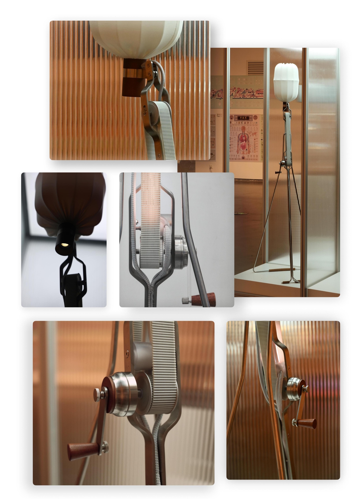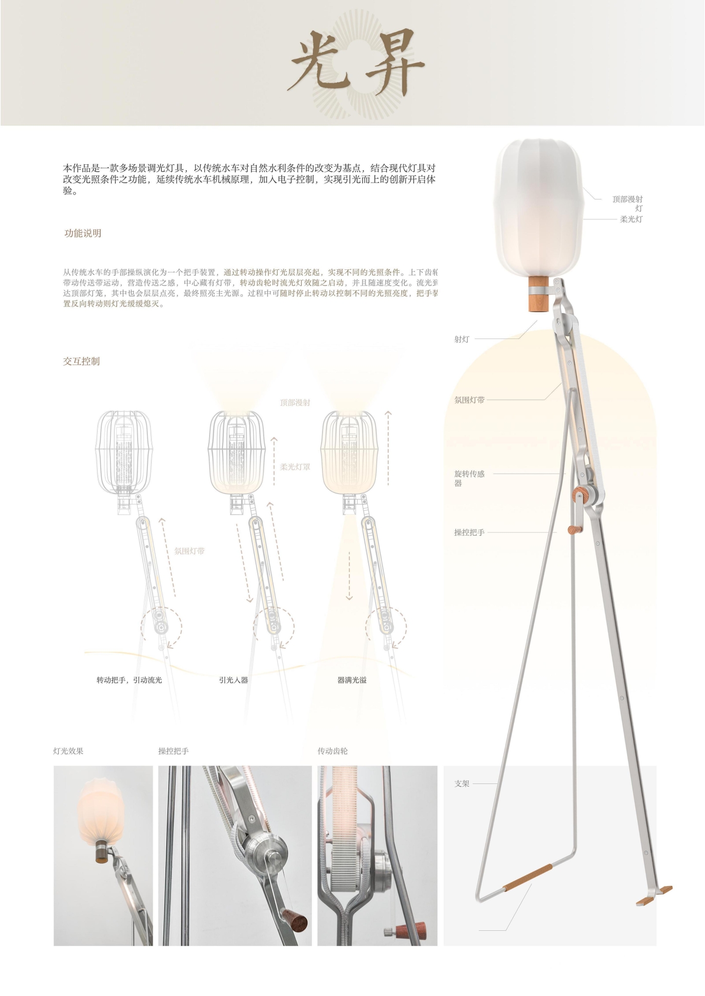 这个作品很有意思,吴冬玥把传统水车作为创意灵感,创新设计了造型独特的一款落地灯。吴冬玥说,传统水车内含杠杆、齿轮、绳带等基本机械结构,“光昇”这款落地灯通过延续传统水车的机械原理,将电子传感器介入其中,实现了引光而上的美妙灯光互动体验。