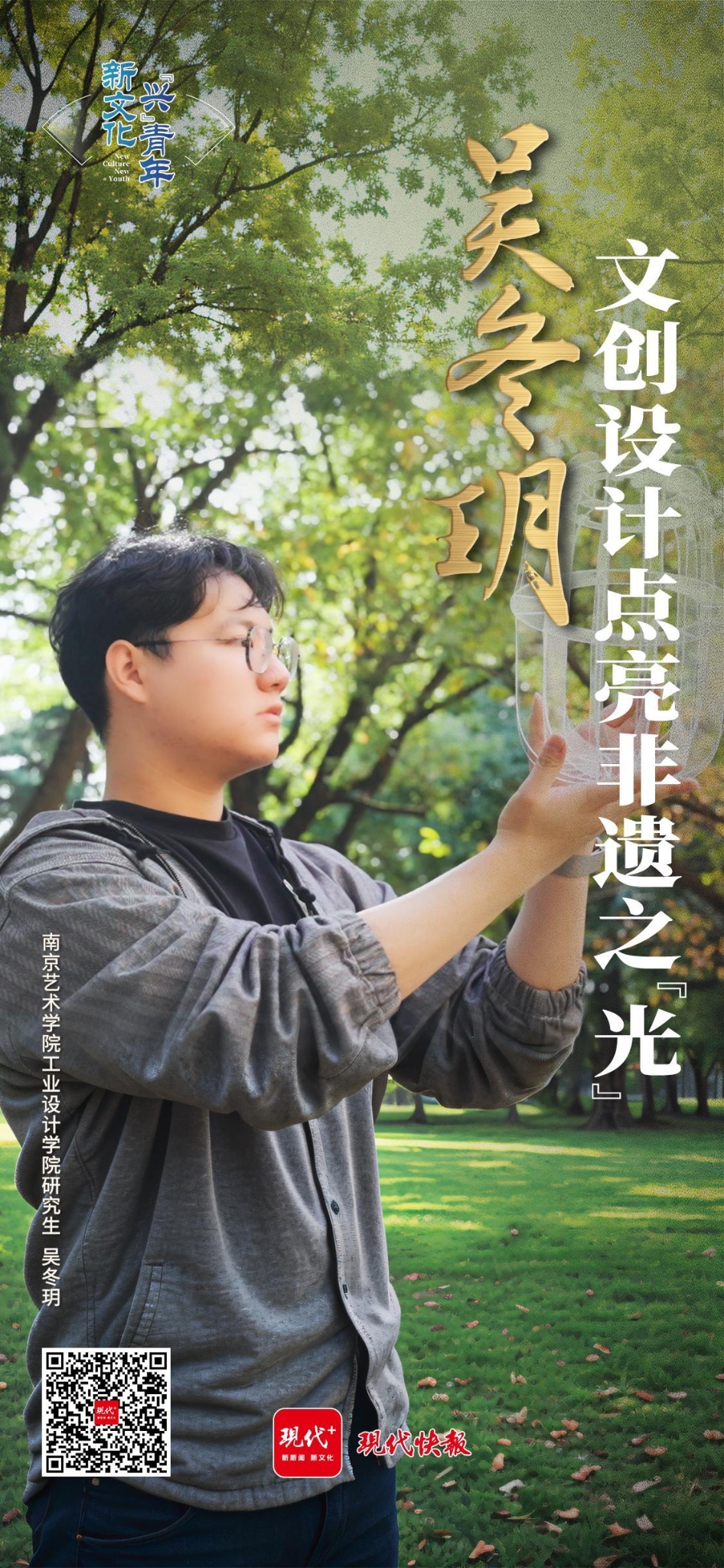 “上了大学后,身边充满‘脑洞’的同学,通过他们的创意把传统文化转化成有趣的文创生活用品,这个时候我就想,或许我也可以试试。”2023年,吴冬玥跟着南京艺术学院工业设计学院院长张明,与团队合力创作的《光昇·熻煜——中国造物文化现代转译研究系列灯具》斩获江苏省第十届“紫金奖”金奖。