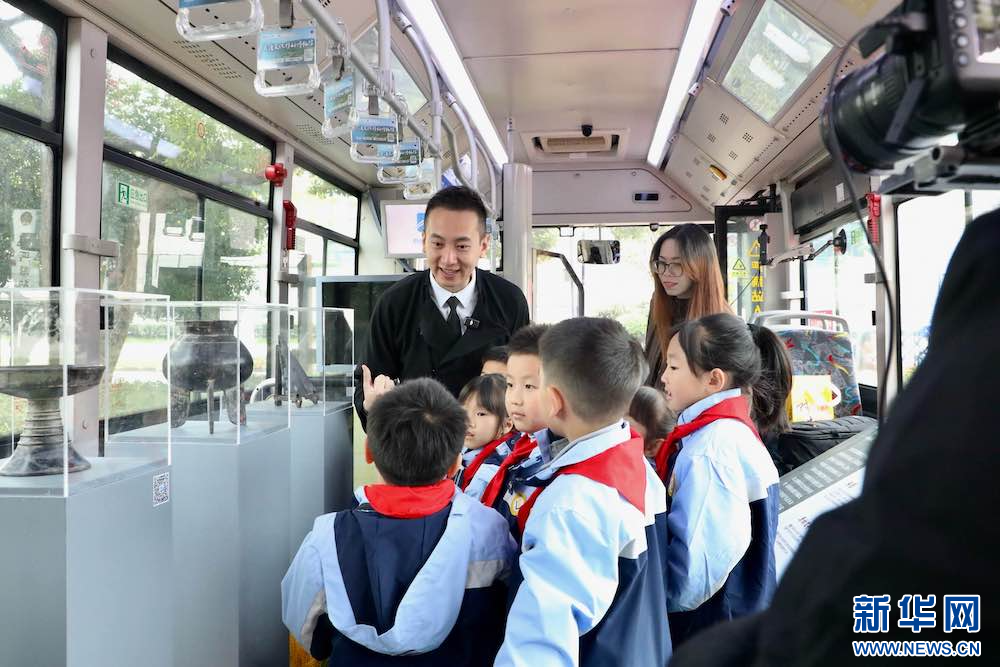 在杭州的大街小巷里,或许会碰上这样一辆特殊的公交车,上面载的并不是乘客,而是一排排精致的良渚古城遗址重要文物复制品以及特色文创产品。玉琮、玉璧、玉钺、陶鼎、双鼻壶、刻纹宽把杯……丰富的展品和文创,吸引了不少孩子围观。