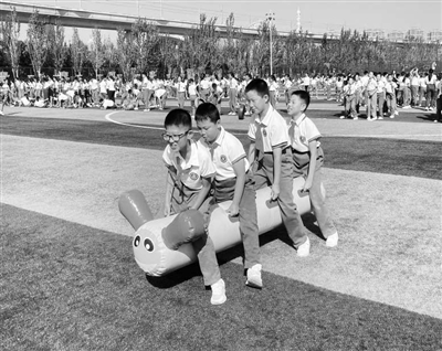 大课间的游戏运动项目也全部由教师自主开发,根据小学生和中学生的体质特点,目前已开发出小学项目48个、中学项目32个,每天中学部和小学部的大课间依次进行,每个班学生每天都能尽情玩2个项目。