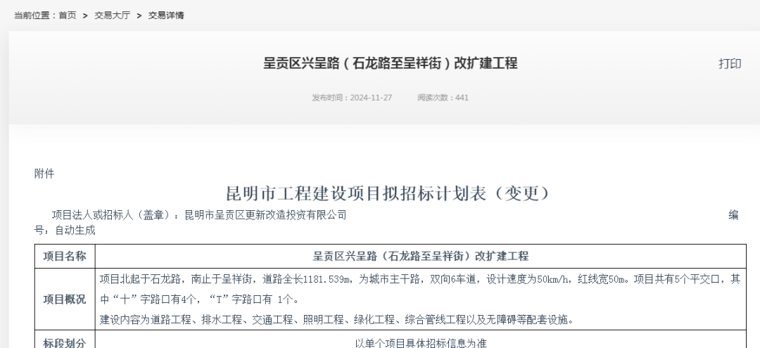 昆明信息港讯(昆明日报 全媒体记者李梦瑶)11月27日,云南省公共资源交易信息网发布《呈贡区兴呈路(石龙路至呈祥街)改扩建工程》招标计划。