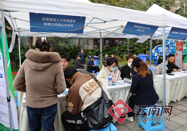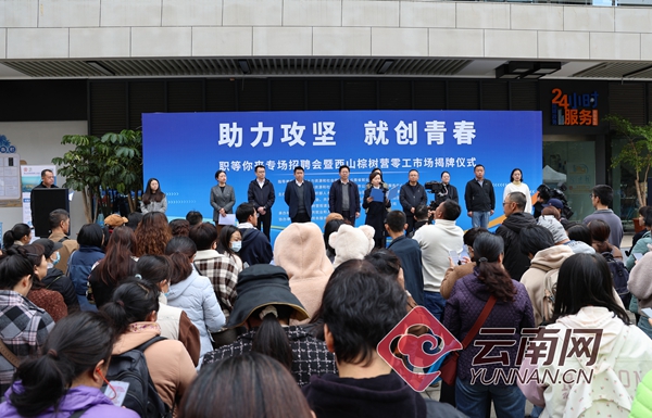 11月22日,昆明市西山区2024年“助力攻坚 就创青春”西山招聘专场暨直播带岗线下线上招聘活动在西山人才公园内举行。棕树营零工市场同步揭牌启用。