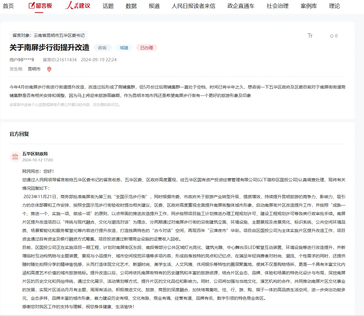 据人民网领导留言板了解,2023年11月21日,商务部批准南屏街为第三批“全国示范步行街”,同时根据昆明市委、市政府关于旅游产业转型升级、提质增效,持续提升昆明旅游的竞争力、影响力、吸引力的总体部署和工作安排,按照全国示范步行街验收时提出相关建议,五华区委、区政府高度重视全面提升南屏街整体城市形象,启动南屏街片区改造提升工作,并按照“成熟一个、推进一个、实施一项、做成一项”的原则,以点带面地推进改造提升工作,同步按照项目施工计划推进办理工程规划许可、建设工程规划许可等各类行政审批手续。(掌上春城 记者何葭凝)