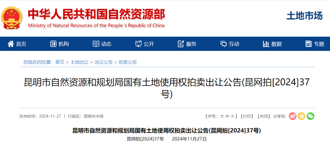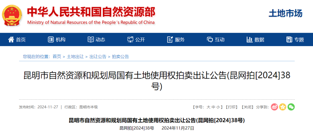 11月27日,自然资源部发布了两则“昆明市自然资源和规划局国有土地使用权拍卖出让公告(昆网拍[2024]37号)、(昆网拍[2024]38号)”,内容显示官渡区共有13宗土地的使用权将于12月18日集中拍卖,其总面积为335111.53平方米,约502亩,起拍总价约为29亿元。
