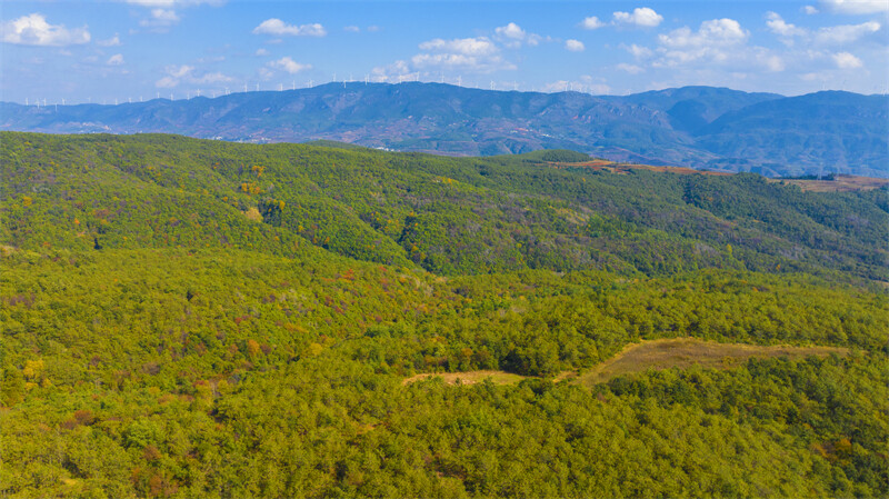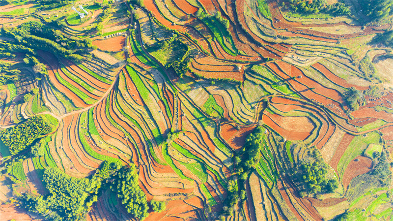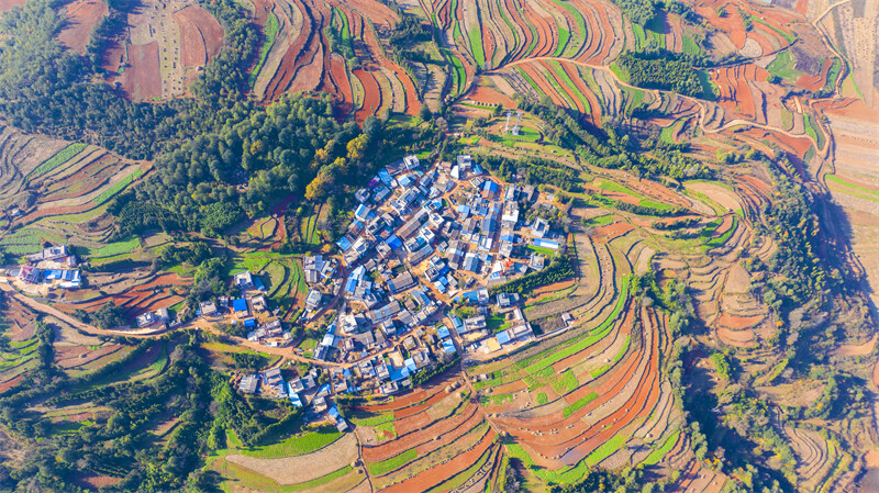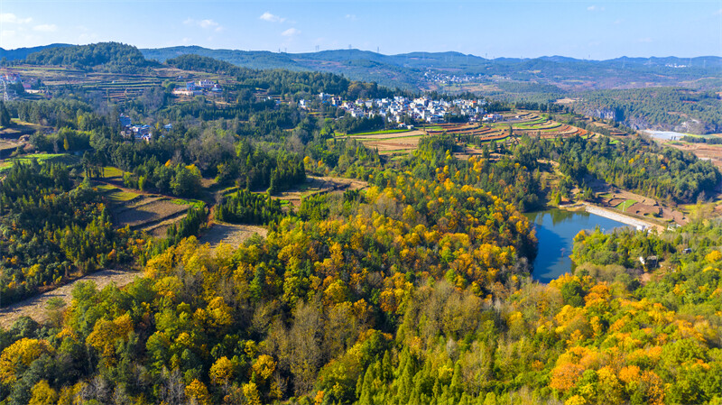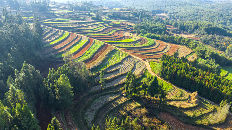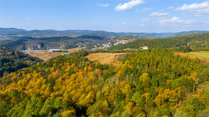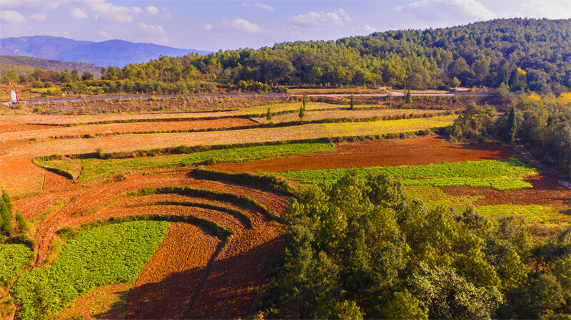 在初冬的暖阳下,繁茂的树木、红色的土地、锦绣的村庄交相辉映,层叠起伏,色彩斑斓,宛如一块平铺大地上的调色盘。冬日的三道箐林场是多彩的,娇艳的,犹如一幅颇具韵味的千里江山图,在美丽富饶的滇东北大地上徐徐展开,让人沉浸在这多情曼妙的山水间……