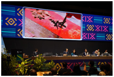 12月4日,在巴拉圭亚松森联合国教科文组织保护非物质文化遗产政府间委员会第19届常会评审现场,大屏幕播放春节宣传视频。新华社记者朱雨博摄