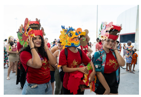 2024年2月3日,在巴西累西腓,人们在中国春节庆祝活动上展示自己制作的龙头。新华社记者王天聪摄