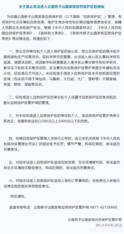 针对此类非法进入自然保护区的行为,云南轿子山国家级自然保护区管护局此前已发布禁止非法进入的通告。