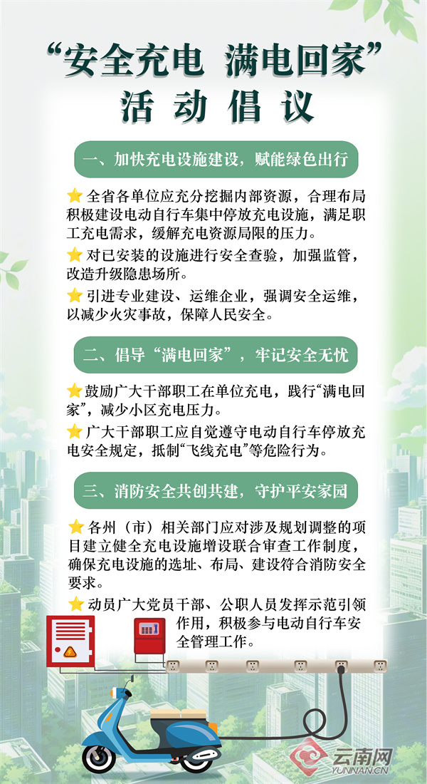 一是倡议全省各机关、团体、企事业单位及机构加快充电设施建设,赋能绿色出行;二是倡议广大干部职工“满电回家”,牢记安全无忧;三是倡议消防安全共创共建,守护平安家园。