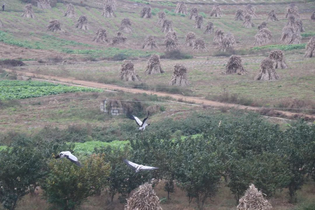 在碧凹村的田间地头,优雅的黑颈鹤怡然自得,或悠闲漫步,或专注觅食,或振翅翱翔。它们与田间劳作的村民相互映衬,勾勒出了一幅人与自然和谐共生的绝美画卷。据马敏龙介绍,黑颈鹤会在每年农历十月份左右飞来,要到第二年农历三月份才会迁徙离开。
