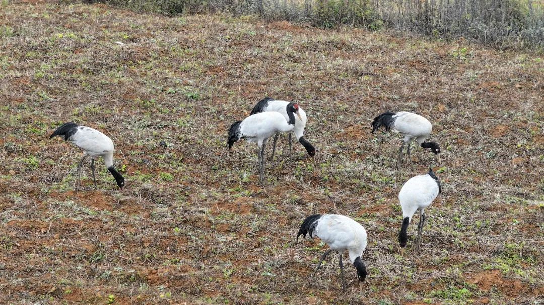 为确保黑颈鹤有良好的栖息环境,当地党委政府安排固定人员适时进行投食,动员群众全力保护好它们的生活环境。