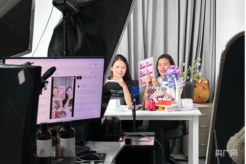 留学生正在基地直播(央广网记者 杨贇 摄)