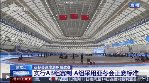总台记者 冯志远:黑龙江省冰上训练中心速滑馆承办本次测试赛,亚冬会期间,速度滑冰的比赛也将在这里进行。