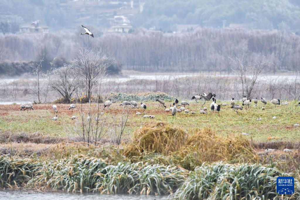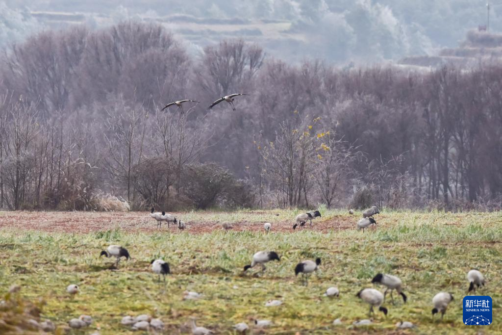在会泽黑颈鹤国家级自然保护区,黑颈鹤、灰鹤等鸟类在觅食(12月14日摄)。新华社记者 王静颐 摄