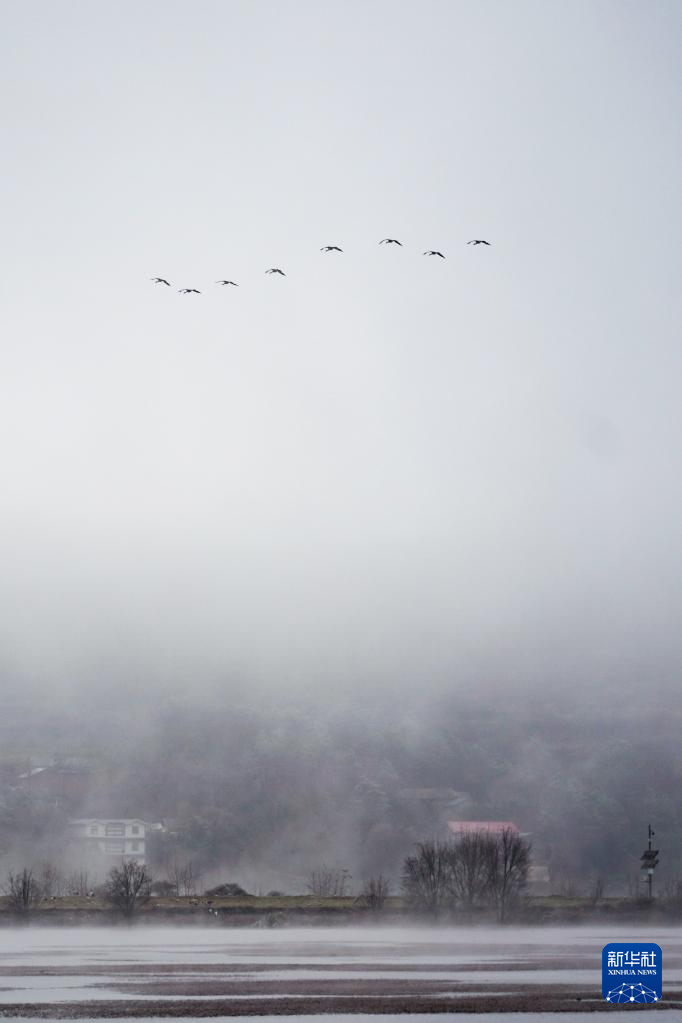 一群黑颈鹤在会泽黑颈鹤国家级自然保护区飞翔(12月14日摄)。新华社记者 王静颐 摄