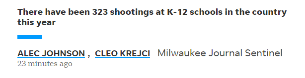 据《今日美国报》旗下《密尔沃基哨兵报》网站16日报道,美国K-12校园枪击数据库(K-12 School Shooting Database)的数据显示,加上威斯康星州的这起枪击事件,今年美国已经发生了323起校园枪击。