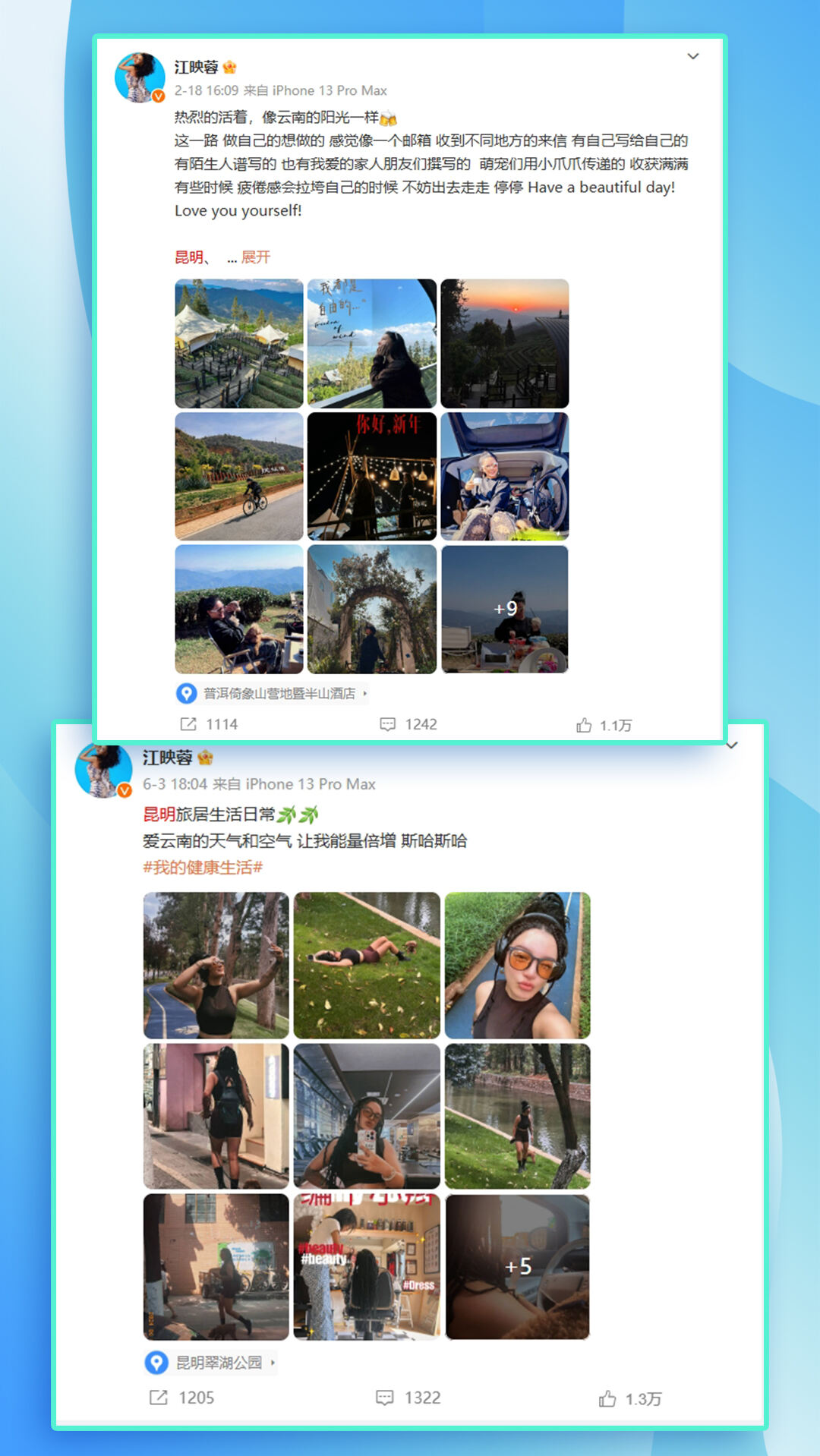 “爱云南的天气和空气,让我能量倍增。”