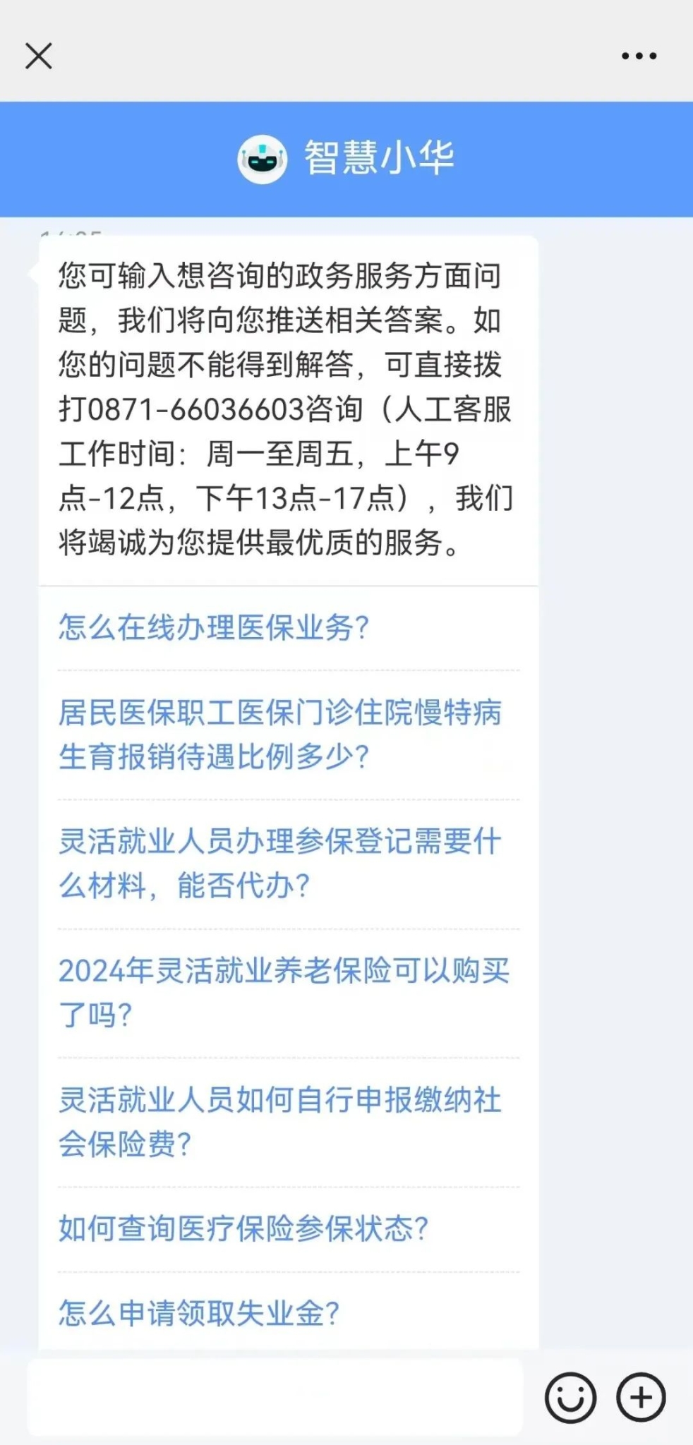 “上线以来,线上咨询业务已达3000余件。”五华区政务服务局副局长杨禄旺介绍,办事人只需进入“五华政务”微信公众号,点击下方“智慧问答”版块,就能在对话框进行问答互动,或输入“转人工”进行咨询。办事人可足不出户了解想办业务的基本信息、申请材料、办事指引和常见问题等详细办事指南,解决群众在办理政务服务事项时可能面临的“寻找难”“理解难”“多趟跑”等问题。